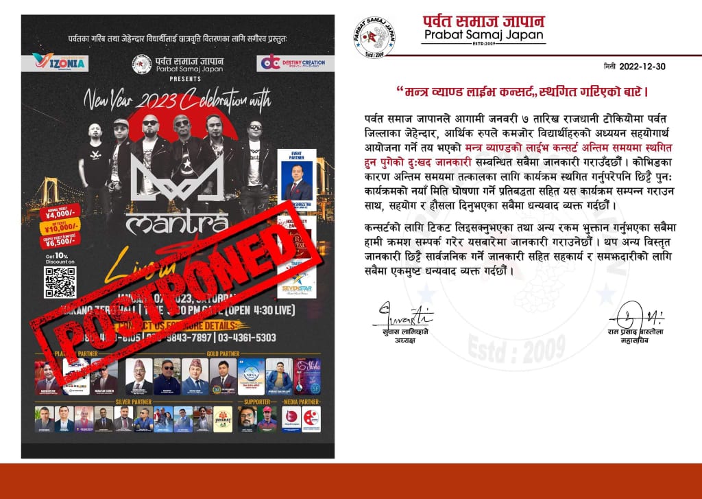 जनबरि ७ तारिक २०२३ मा मन्त्र ब्याण्डको कन्सर्टको साथमा अन्य सांस्कृतिक कार्यक्रम आयोजना गरेकोमा कोरोना महामारी बढ्दा नेपालबाट कलाकार आउन समेत समस्या भएपछि कन्सर्ट स्थगित गरीएको पर्वत समाज जापानका महासचीव राम बस्तोलाले जानकारी दिए । उनले कन्सर्ट स्थगित भए पनि सोही दिन नेपाली चलचित्र महापुरुष पर्दर्शन प्रदर्शन गरिने जानकारी दिए ।