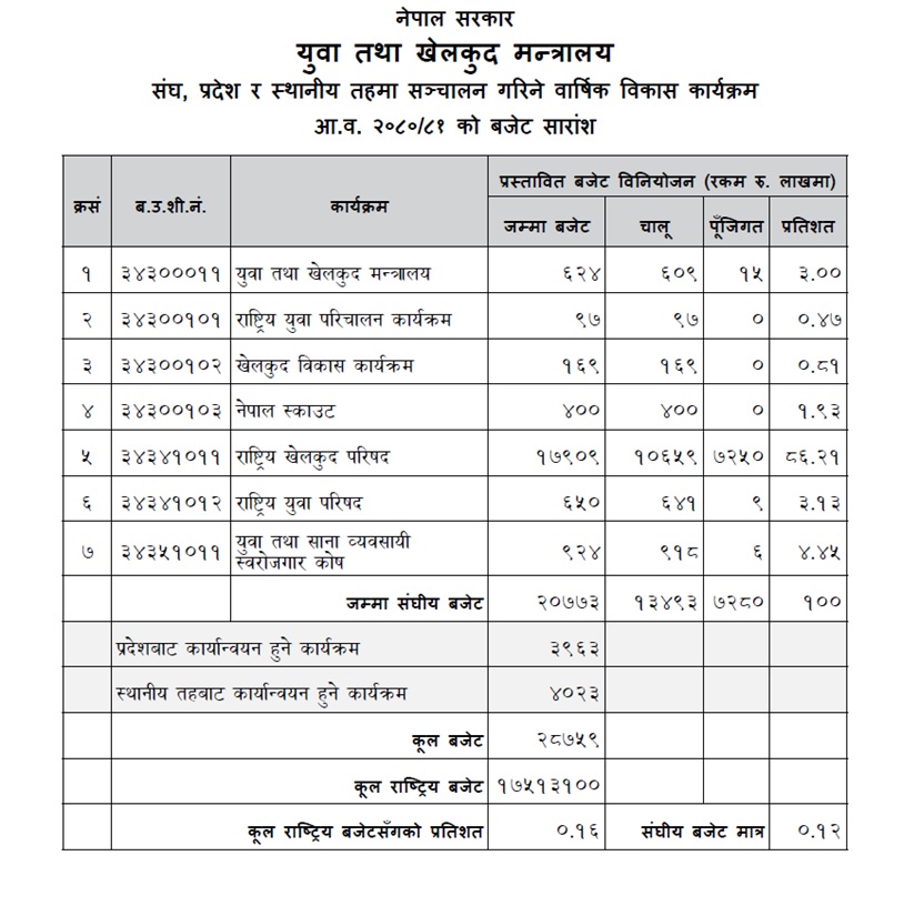 नेपालमा युवाहरुको बर्तमान बजेटको आकारसंविधानमा युवा: वर्तमान नेपालको संविधान २०७२ को भाग ३ मा मौलिक हकको विभिन्न व्यवस्था र भाग ४ मा राज्यका निर्देशन सिद्धान्त, दायित्व तथा नीतिहरुमा समेत युवा विकास एवं युवा परिचालनका बारेमा विशेष व्यवस्था गरिएको छ । धारा ४८ मा नागरिक कर्तव्यको बारेमा उल्लेख गरिएको छ भने धारा ५१ ञ ७ मा देहायको कुरा उल्लेख गरिएको छ ः “राष्ट्रिय विकासमा युवा सहभागिता अभिवृद्धि गर्दै राजनीतिक, आर्थिक, सामाजिक र सांस्कृतिक अधिकारहरुको पूर्ण उपयोगको वातावरण सिर्जना गर्ने, युवाको सशक्तीकरण र विकासका लागि शिक्षा, स्वास्थ्य, रोजगारी लगायतका क्षेत्रमा विशेष अवसर प्रदान गर्दै व्यक्तित्व विकास गर्ने तथा राज्यको सर्वाङ्गीण विकासमा योगदानका लागि उपयुक्त अवसर प्रदान गर्ने । ‘’
