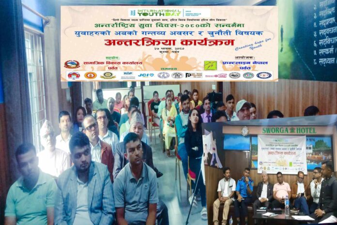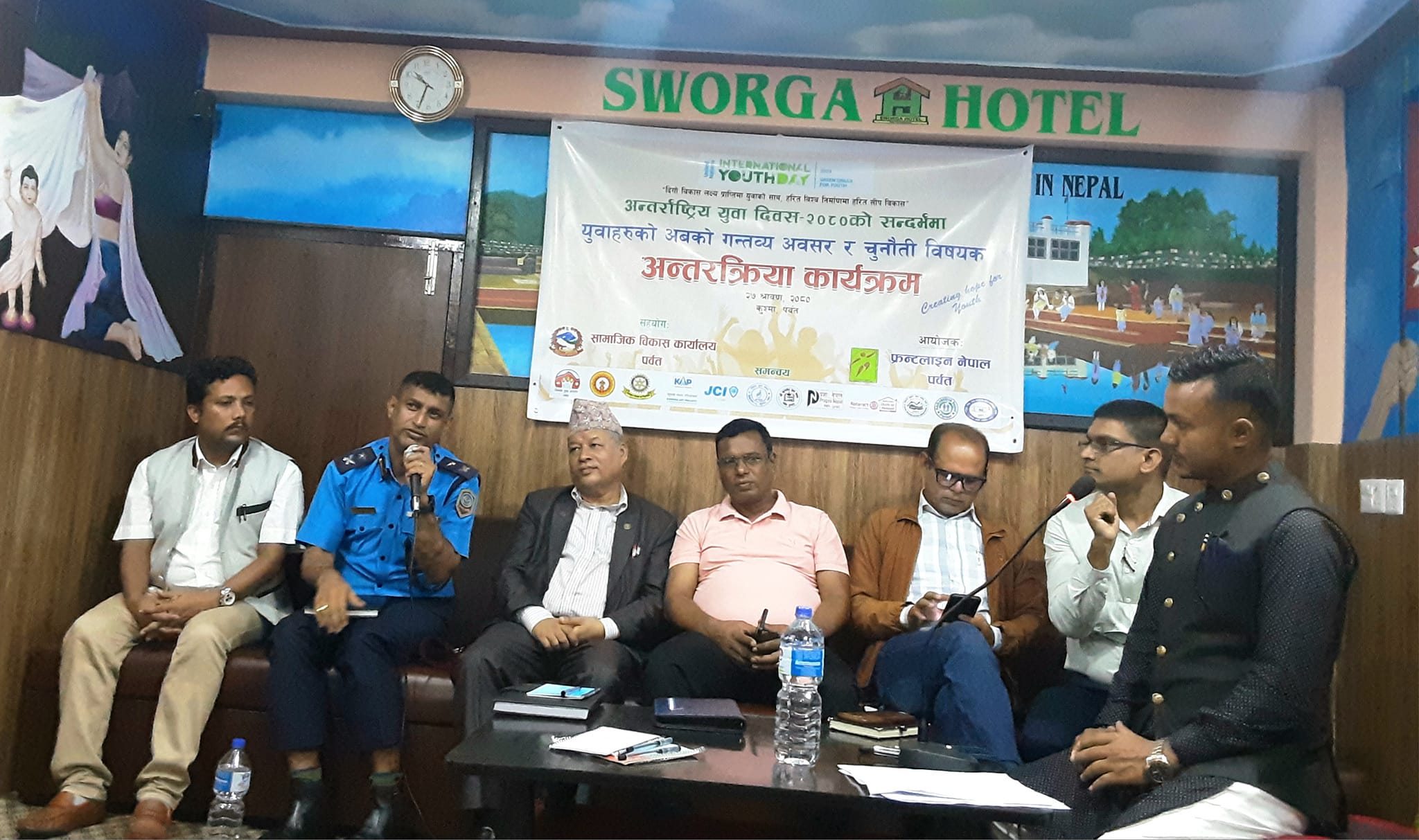 अन्तरास्ट्रिय युवा दिवसका अवसरमा पर्वतमा अन्तरक्रिया कार्यक्रम सम्पन्न भएको छ । जिल्ला स्थित युवाहरु सम्मेलित संघसंस्थाहरुको आयोजनामा युवाहरुको अबको गन्तव्य अवसर र चुनौती विषयक अन्तरक्रिया कार्यक्रम सम्पन्न भएको छ हो ।