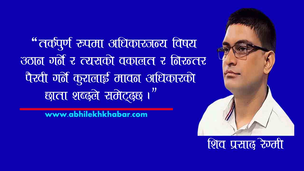 मानवअधिकारको सिमा एकदम फराकिलो र गहन छ । यसका विभिन्न आयामहरु छन । मानवअधिकार र नागरिक समाजको भुमिकामा स्वफुर्त काम गर्ने क्रममा आज कुनै व्यक्ति अगुवा नेतृत्व र कुनै संस्था अगुवा संस्था भएर काम गरेको छ होला । यदि कहिँ कसैलाइ त्यो प्रयास र प्रयत्न पुर्ण लागेको छैन भने आलोचना होइन आफू स्वतस्फूर्त रुपमा नेतृत्वदायि ढंगले अधिकारको वकालत र पैरवी गर्न समेत कसैलाई कुनै बाधा रहेको छैन । स्मरण रहोस, हरेक नागरिकलाई त्यो अधिकार छ र दायित्व पनि छ । मानवअधिकारको वकालत गर्ने जिम्मेवारी सहित कहिँ कसैलाई मात्रै लाइसेन्स अनुमति दिइएको विषय पनि होइन ।