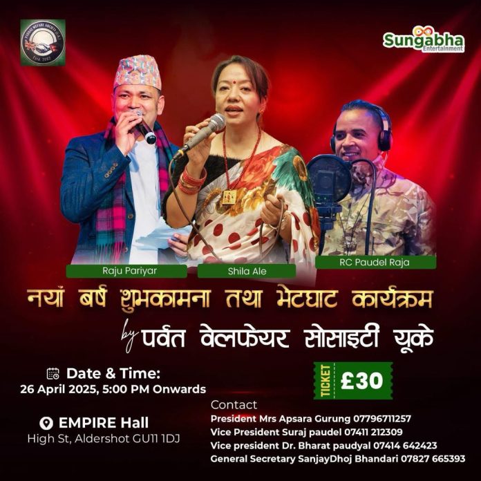 पर्वत वेलफेयर सोसाइटी यूकेले नयाँ बर्षको अवसरमा शुभकामना आदानप्रदान तथा भेटघाट कार्यक्रम आयोजना गर्दैछ । चाडपर्व तथा उत्सवहरुमा विभिन्न सामाजिक कार्यक्रम आयोजना गर्दै आइरहेको सोसाईटीले नयाँ बर्ष विशेष कार्यक्रम यही अप्रिल २५ तारिख अल्डरसट स्थित एम्पायर हलमा आयोजना गर्न लागेको हो